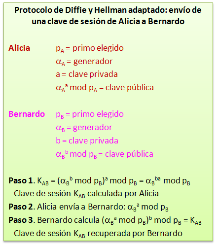 El ejercicioRSA3.1.2 te permitirá comprobar cómo funciona este segundo protocolo de Diffie y Hellman en el intercambio de una clave de sesión, primero entre Alicia y Bernardo y luego entre Bernardo y Alicia.
