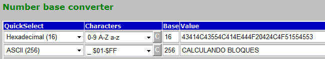 Para comprobar que el descifrado 43414C43554C414E444F20424C4F51554553 corresponde al texto en claro, puedes usar cualquier conversor de hexadecimal a ASCII 256 como este Online conversion utilities.