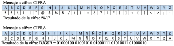 Si se supone que no conoces el código ASCII, ¿qué sería más enigmático para ti, leer \%“[ª o leer 01000100 01001010 01000111 01010011 01000010? En el primero se ha cifrado el texto de 5 letras CIFRA con un alfabeto especial sin letras y en el segundo se ha representado el valor ASCII en binario del carácter siguiente del alfabeto en el mensaje, tal y como se muestra en la figura.