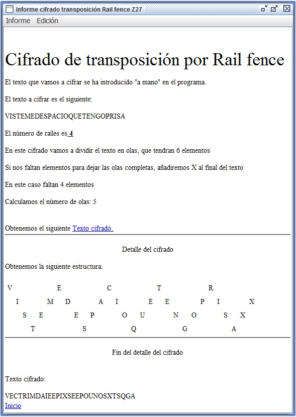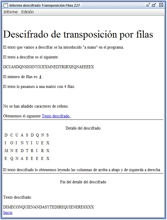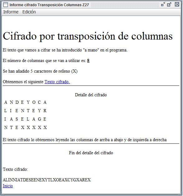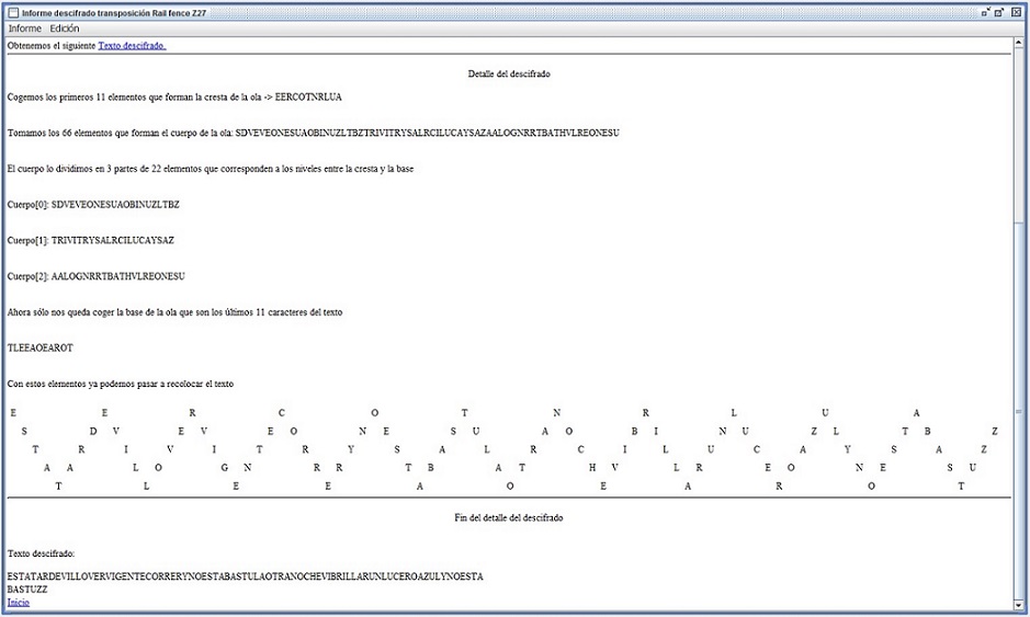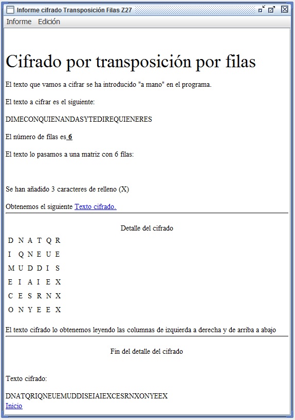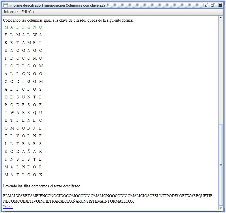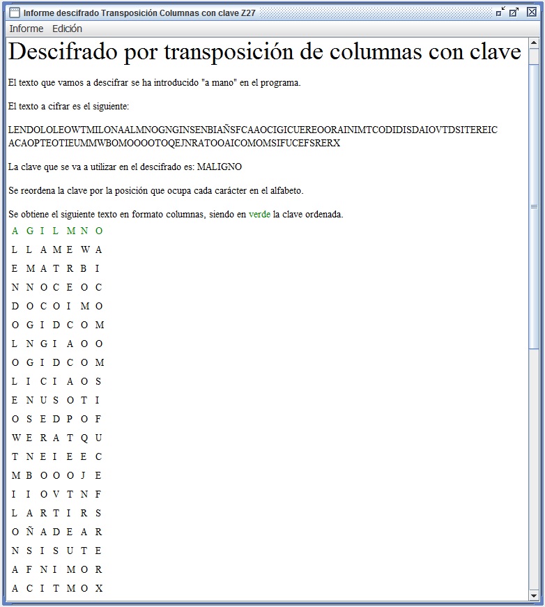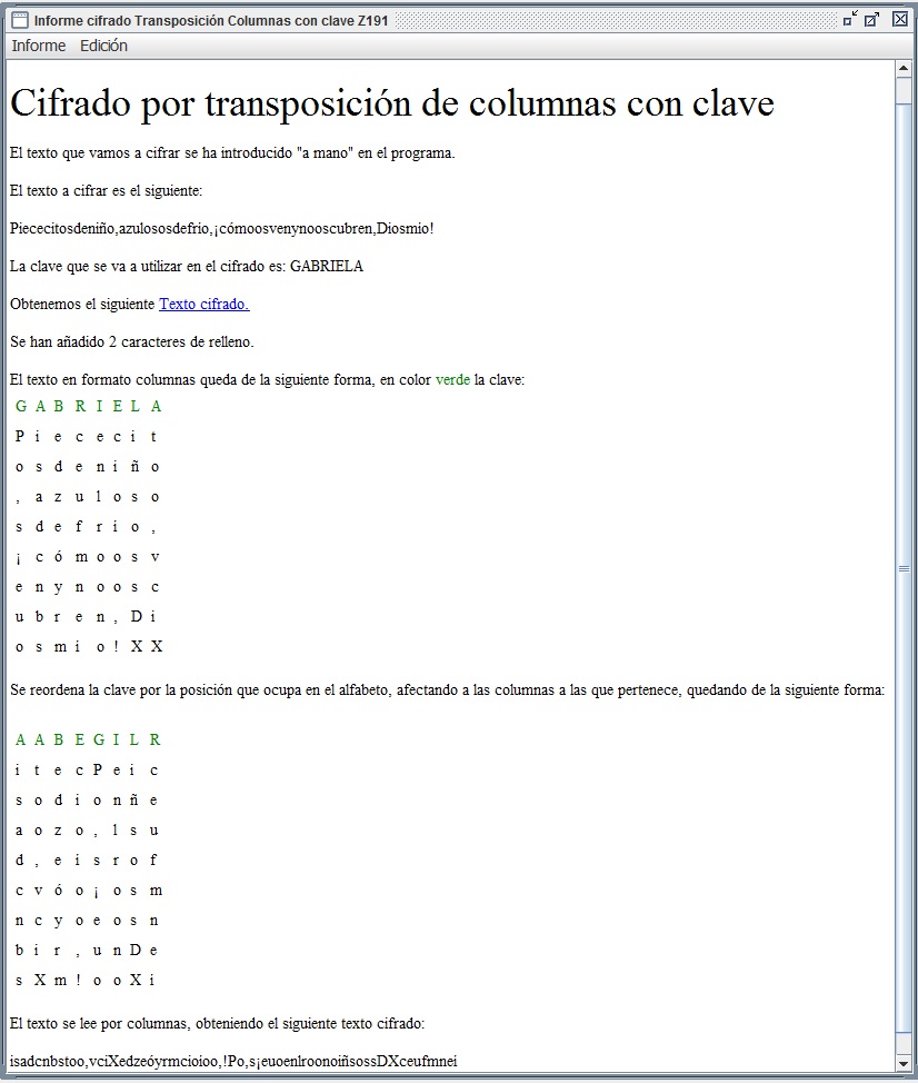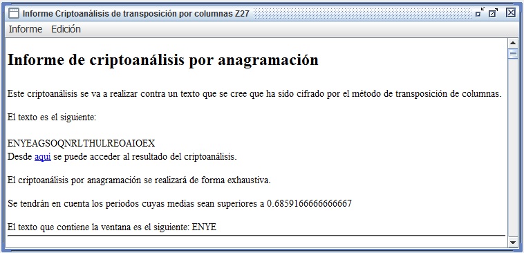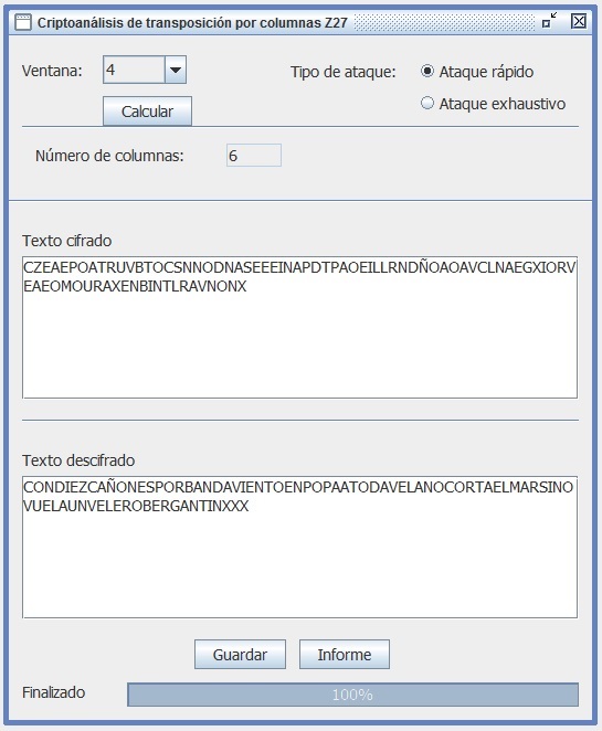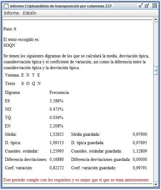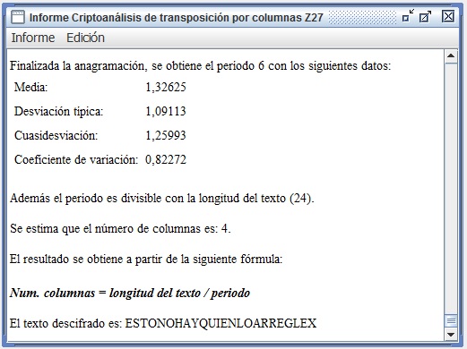 En la figura 3.3 se recoge el informe que entrega Criptocásicos ante el criptoanálisis del ejemplo anterior, donde se observa el período (filas en este caso) encontrado igual a 6, así como la clave de 4 columnas y el texto en claro.