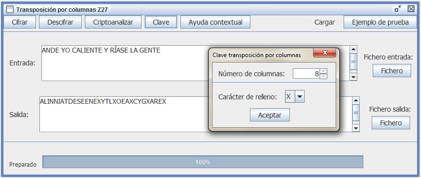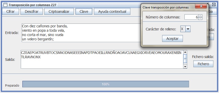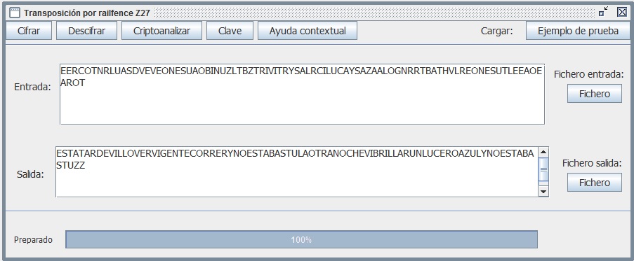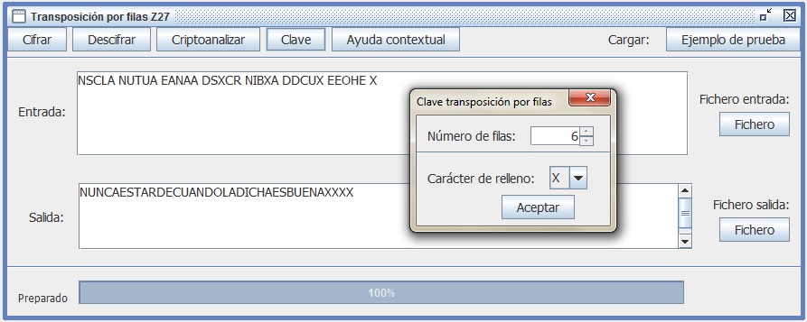 En el ataque por fuerza bruta intentarás descifrar el criptograma suponiendo primero que la clave son 2 filas y presionas Descifrar. Si falla el descifrado, aumenta la clave a 3, etc., repitiendo el proceso hasta dar con el resultado deseado. Comprueba que al llegar a 6 obtienes un texto en claro con sentido: NUNCA ES TARDE CUANDO LA DICHA ES BUENA.