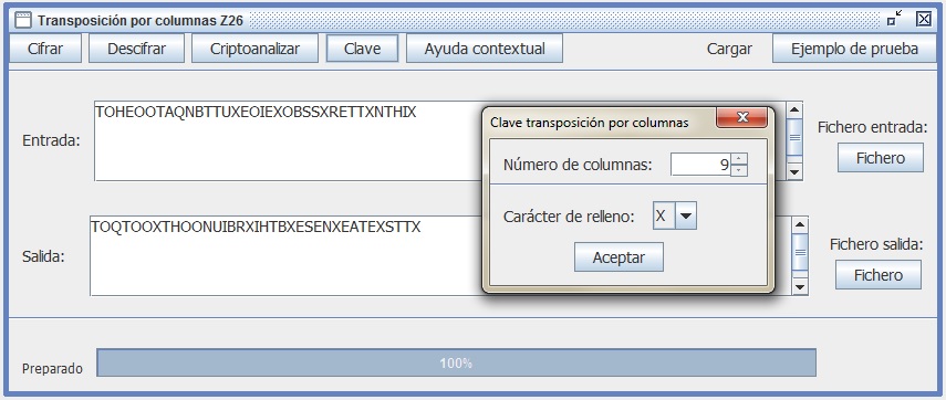 Como el criptograma tiene 35 letras y la clave es Cl = 7, el número de filas Fl será igual a 35/7 = 5. Escribimos entonces el criptograma por columnas de arriba hacia abajo y de izquierda a derecha en 5 filas, de forma que la primera columna será MPNEV, la segunda columna AAMCO, la tercera columna SJAIL, la cuarta columna VANEA, la quinta columna ARONN, la sexta columna LOQTD y la séptima columna EEUOO. Para descifrar, procedemos ahora a leer por filas de arriba hacia abajo y obtenemos el texto en claro M = MÁS VALE PÁJARO EN MANO QUE CIENTO VOLANDO.
