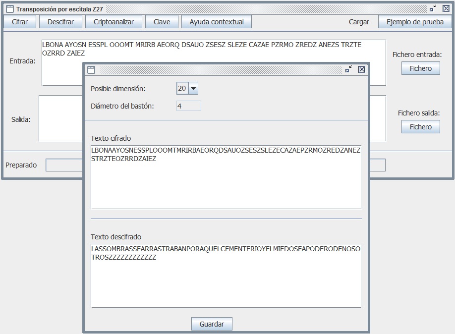 Práctica 2. En el criptoanálisis, introducimos el criptograma como Entrada y damos a Criptoanalizar. Criptoclásicos nos va presentando distintas opciones de dimensión o longitud del bastón (2, 4, 5, 8, 10, 16, 20, 40) y, al elegirlas, nos indica el posible diámetro del bastón así como el posible texto en claro. Con la dimensión 20 se rompe la cifra al obtener un texto en claro con sentido.