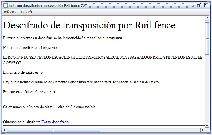 Así, en el caso de la cifra de la figura 2.6 se tenía como datos: 16 letras en el criptograma (dos de ellas de relleno) y cifrado por tres raíles. Con esto, al descifrar se calcula que cada ola tendrá 3x2 - 2 = 4 elementos y como 16/4 = 4 habrá cuatro olas. Por tanto los primeros 4 elementos del criptograma serán la cresta de la ola, los últimos 4 elementos del criptograma serán la base de la ola, y los restantes 8 elementos se distribuirán entre los raíles itermedios, en este caso sólo uno. Como el criptograma era CALCI RRIFN EZFAE Z, entonces CALC formará la cresta de la ola, FAEZ formará la base de la ola, e IRRIFNEZ formará el raíl central. Se procede a escribir esto en el formato Rail fence y se lee en forma de zig zag, obteniendo el texto en claro: CIFRARAILFENCEZZ = CIFRA RAIL FENCE.