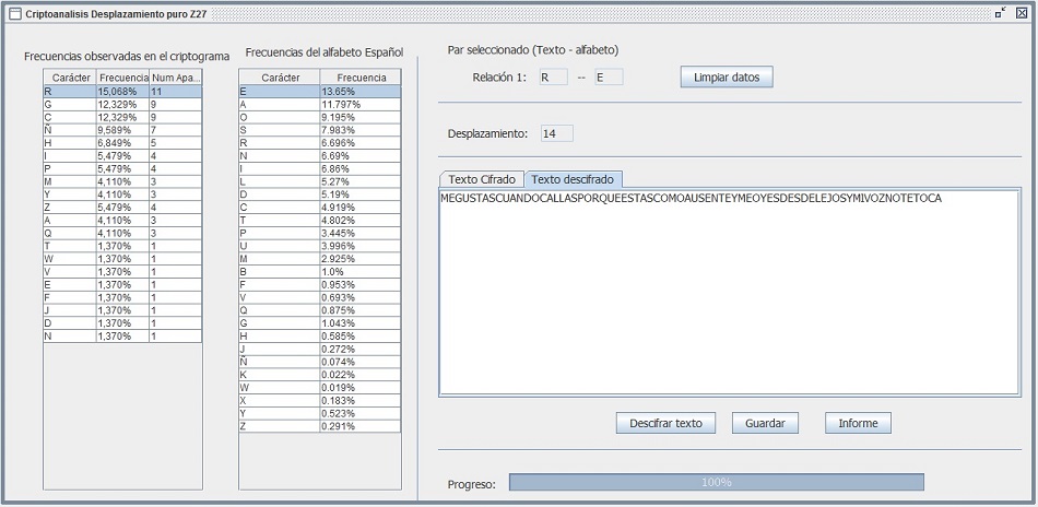 Si la cifra es por desplazamiento puro, buscaremos la letra más frecuente del criptograma y la asociaremos -en primera instancia- a la letra E, que es la más frecuente de nuesto alfabeto. Si la elección ha sido la correcta, esto nos indicará inmediantamete el desplazamiento empleado pues sabemos que la letra E tiene el código 4, al que sumado el desplazamiento b nos debe dar el código de esa letra más frecuente en el criptograma.