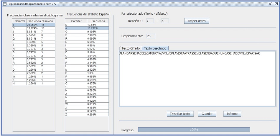 También pueden utilizarse las estadísticas del lenguaje que se manifiestan en el criptograma. Así, si el texto en claro es lo suficientemente extenso, por ejemplo sobre 100 letras, entonces la letra más frecuente del criptograma debería corresponder a la cifra de la letra E que es la más frecuente del castellano, o bien a la letra A que es la segunda más frecuente. Raras veces habrá que considerar en esta posicion a la letra O, la tercera letra más frecuente del castellano, o la siguiente que es la S. En el próximo ejemplo de laboratorio se ponen de manifiesto los dos primeros casos.