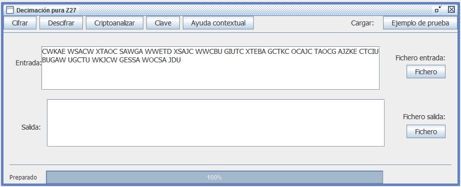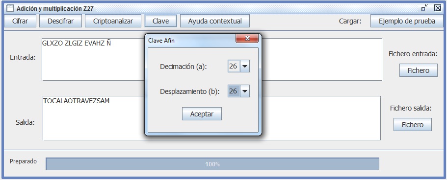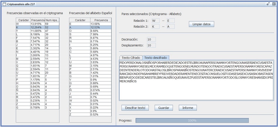 Vamos descifrando entonces el criptograma con esta última ecuación y si obtenemos un texto en claro con sentido, habremos encontrado la clave, en este caso la constante de decimación a. Esto último porque puede darse el caso de que el criptoanálisis entregue como resultado un falso positivo; esto es, un valor de a válido pero que no es el utilizado en la cifra. Si no se obtiene un texto con sentido, probaremos asignando nuevamente a la letra E la segunda letra más frecuente del criptograma u otra, hasta dar con la solución. No obstante, dada la alta redundancia que presenta el lenguaje, normalmente acertaremos en el primer intento o en el peor de los casos en el segundo o tercero. No irá más allá.