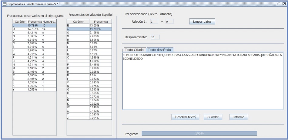 Criptosistemas -> Desplazamiento Puro. Copiamos el criptograma en la caja de texto y damos a Criptoanalizar, obteniendo el siguiente resultado. Para el criptoanálisis, se hace corresponder primero la letra L del criptograma con la letra E del alfabeto (la más frecuente) y no se obtiene el resultado esperado. Se limpan los datos y se hace corresponder ahora la letra L del criptograma con la letra A del alfabeto (la segunda más frecuente) y obtenemos el resultado esperado. El desplazamiento empleado en la cifra ha sido b = 11.