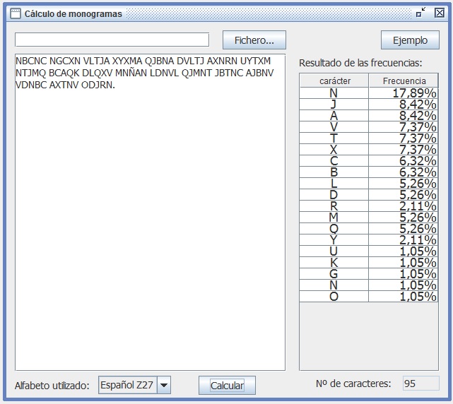 Herramientas -> Estadísticas del lenguaje -> Cálculo de monogramas. Copiamos el criptograma en la caja de texto, elegimos Español Z27 como Alfabeto utilizado y damos a Calcular, obteniendo el resultado que se muestra en la figura.