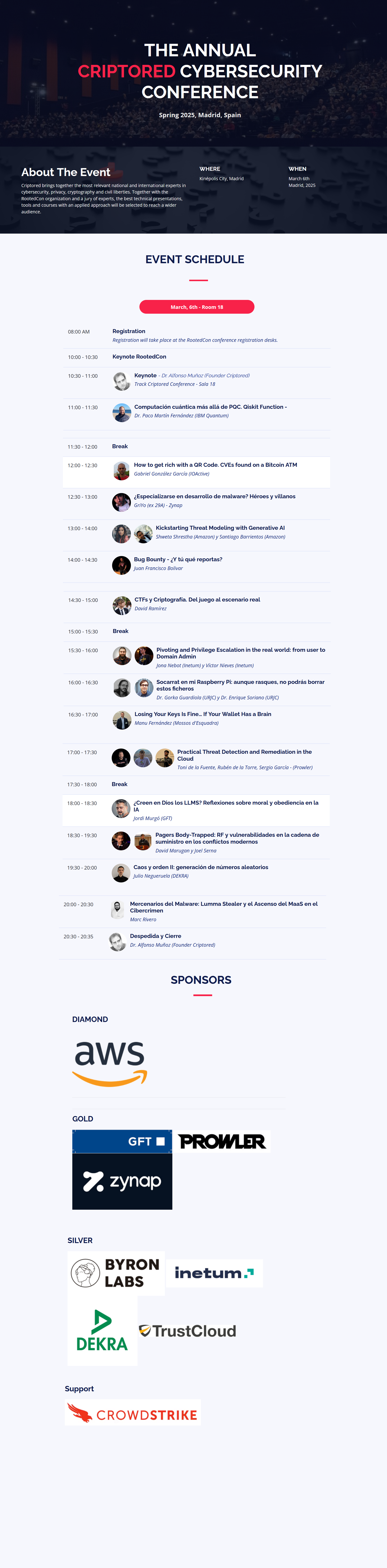 Criptored conference is logistically supported by the RootedCon conference. The purchase of tickets, cfp and access to the conference will use the RootedCon platform and logistics (link). Any doubts: info@criptored.com