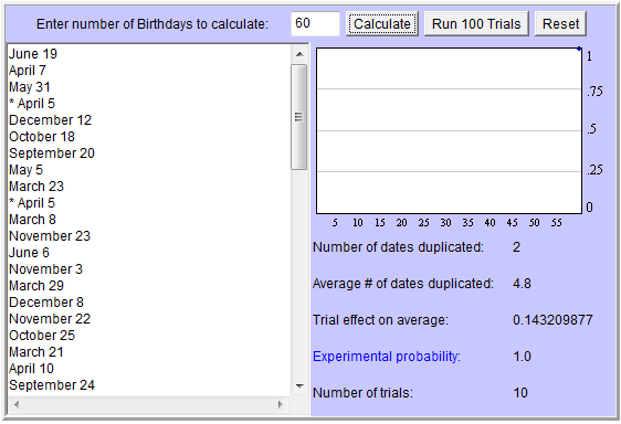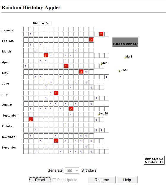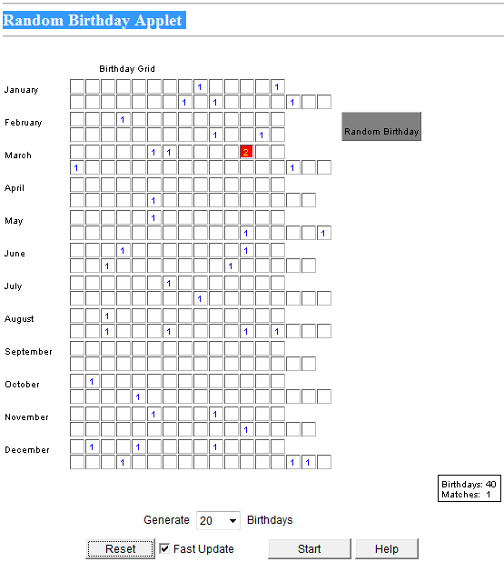 Entra en la aplicación Random Birthday Applet de la Universidad de Stanford de la figura superior. Marca generar 20 cumpleaños en modo Fast Update y ve pulsando en Start.