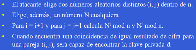 2. Como el atacante conoce la clave pública e, calcula: w = (i - j) / mcd (e, |i - j|)