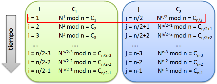 Por tanto, se realiza el primer cifrado de la columna i que nos entrega el valor C1 (obviamente el mismo valor de ataque N) y se compara con el primer cifrado de la columna j que entrega el valor Cj(n/2+1). Se aumentan en una unidad los contadores i y j, repitiendo los cifrados en ambas columnas, hasta que un resultado de la columna j colisiona con un resultado previo de la columna i (o viceversa) y cuando esto último ocurre, habrá culminado el ataque.