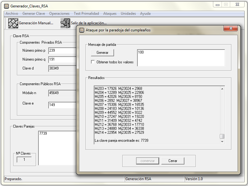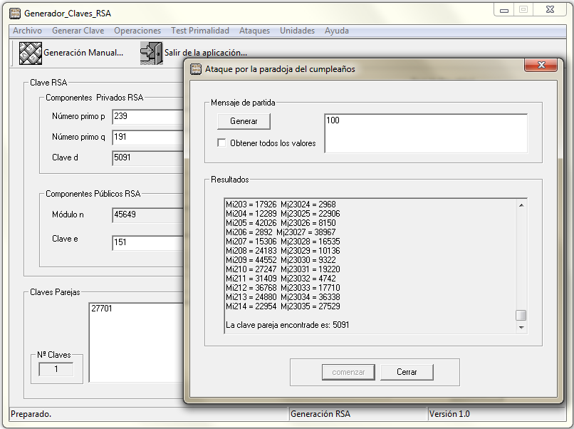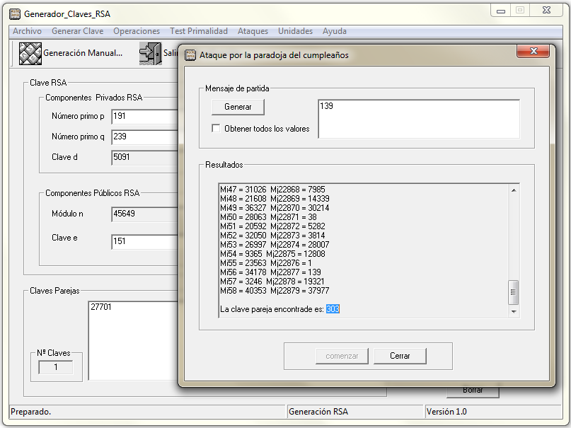 Con el programa genRSA genera la clave con p = 239, q = 191, e = 151 y realiza un ataque por paradoja del cumpleaños siendo el valor de ataque N = 100.