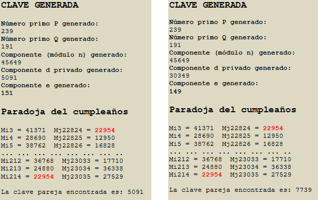 El software genRSA genera un log con el nombre ParadojaLog.html. Los valores iniciales y finales de ambos ataques se muestran a continuación: