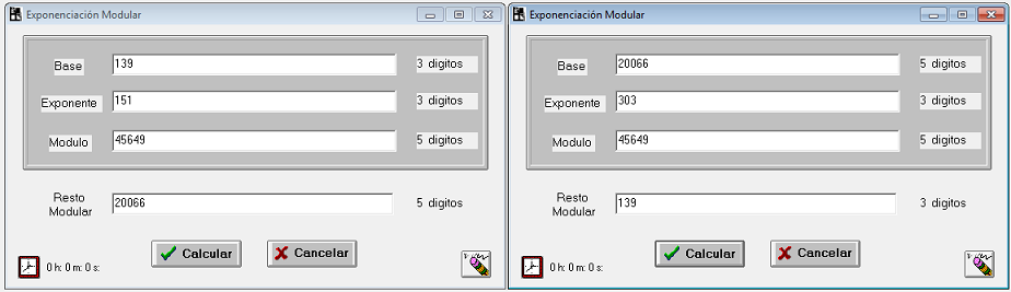 La siguiente figura demuestra que el valor 139 al cifrarse con la clave pública 151 en el cuerpo de cifra 45.649 puede descifrarse con este valor 303. Lógicamente, también lo podremos descifrar con las claves propias d = 5.091 y d' = 27.701.