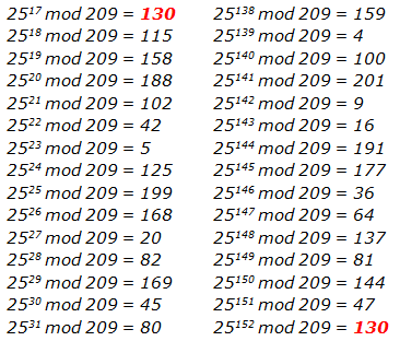 El resultado 25152 mod 209 = 130 colisiona con el valor 2517 mod 209 = 130.