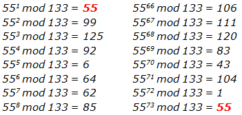 Se ha producido una colisión pues el resultado en j 5573 mod 133 = 55 es igual que el valor en i 551 mod 133 = 55.