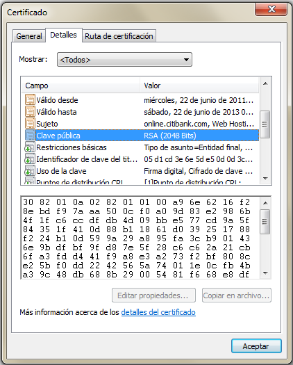 De hecho, si accedes al enlace seguro de un banco online, lo más probable es que te encuentres con un certificado digital X.509 que muestre una clave pública RSA cuyo módulo es de 2.048 bits, como se aprecia en la figura.