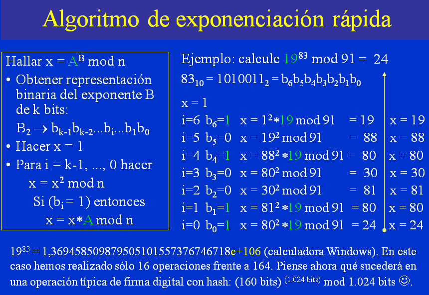 La siguiente figura muestra el algoritmo de exponenciación rápida que encontrarás también explicado en esta dirección.