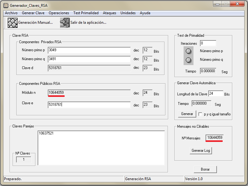Las claves tercera y cuarta de la práctica, así como la que puedes ver en la figura de este apartado, son claves que en próximas lecciones calificaremos como claves RSA óptimas en cuanto muestran sólo 9 mensajes o números no cifrables y una única clave privada pareja, aspectos que serán analizados en las lecciones 5 y 6.