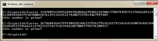 La última prácticaRSA3.2.3 de este apartado consiste en enviar cifrada mediante el programa ExpoCrip una clave de sesión K de 192 bits (58 dígitos) a un servidor Web cuya clave es el último desafío RSA resuelto de 768 bits en diciembre de 2001, y cuyos números primos se indican en la siguiente captura de pantalla del programa factor.exe.
