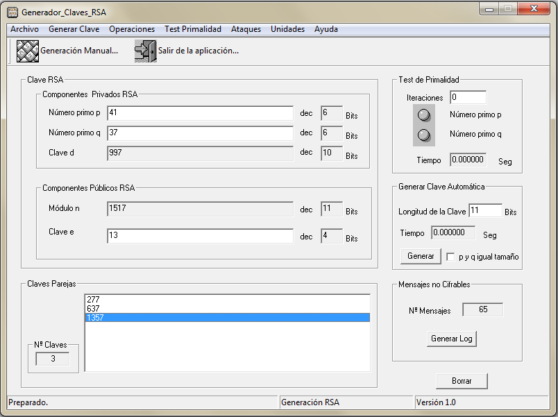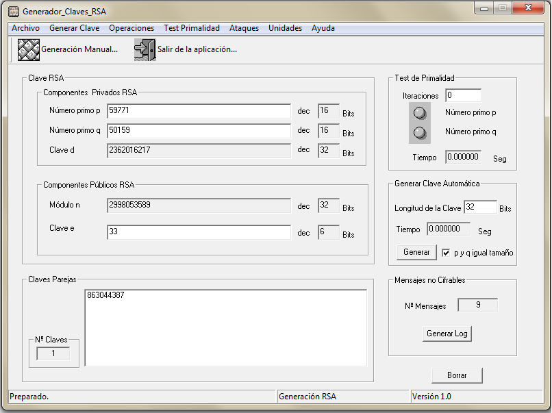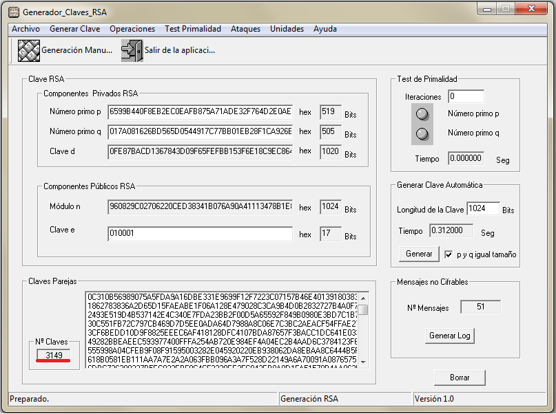 En la siguiente captura de pantalla se muestra una clave que definiremos como óptima, con una clave privada pareja y 9 nueve números no cifrables pero que no se obtiene con primos seguros, en tanto que p = 59.771 y q = 50.159 no son primos seguros.