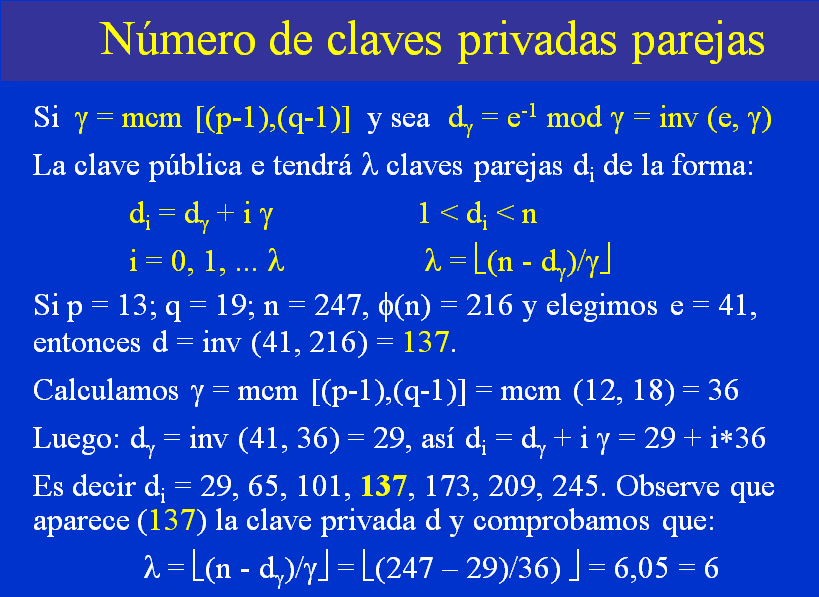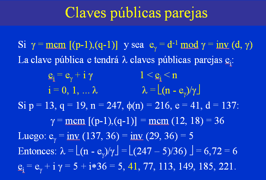 Por lo tanto, si una determinada clave RSA tiene, por ejemplo, 6 claves privadas parejas, tendrá también 6 claves públicas parejas. Simplemente cambiamos los valores de e por d en las ecuaciones de claves parejas vistas en el apartado 4.1 como lo indica la siguiente diapositiva, salvo que como es lógico los números serán distintos.