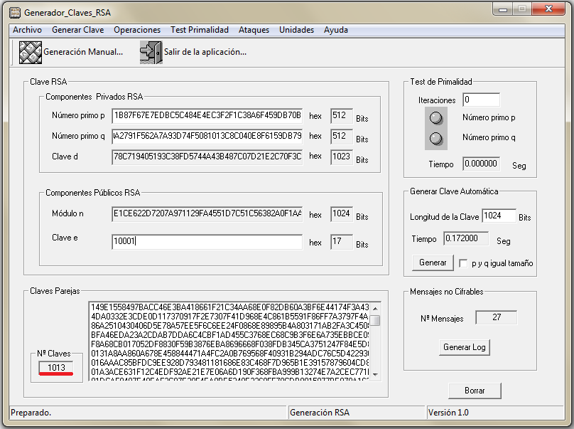 Cuando generes claves con OpenSSL en la Lección 10 verás que por lo general se obtienen claves RSA con una única CPP, aunque el software no asegura que siempre se obtenga ese valor mínimo, como lo comprobaremos en su momento. No obstante, con una librería Crypto++ mucho más antigua, como la de Wei Dai del año 2003 que es la utilizada en el software genRSA, a veces se obtienen claves reales llamativas como la que se muestra en la siguiente captura de pantalla.