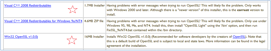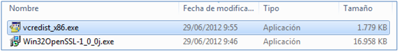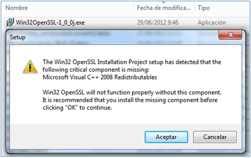 De hecho, de todas las versiones que observarás en la página de descarga indicada, si tu ordenador es de 32 bits, la versión que se recomienda descargar desde comienzos de 2012 es la Win32 OpenSSL v1.0.0j. Además, es necesario tener instalada la librería Visual C++ 2008 Redistributables.