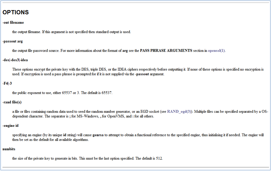 Desde el apartado Documentos de la página Web de OpenSSL observamos los argumentos del comando genrsa.