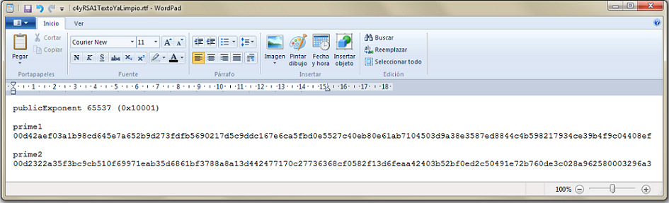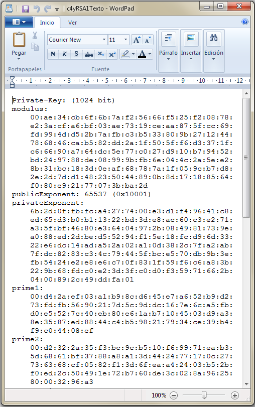Si abrimos el archivo c4yRSA1Texto por ejemplo con WordPad (para mantener el formato) tendremos un documento como éste: