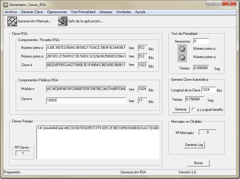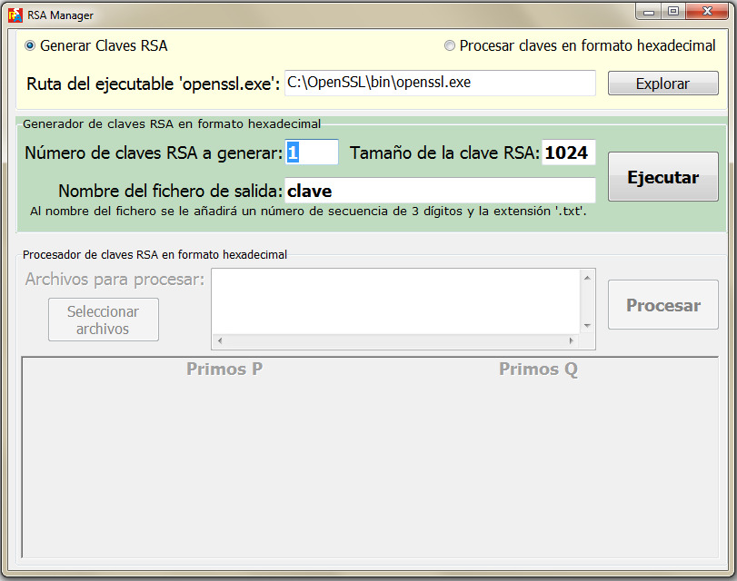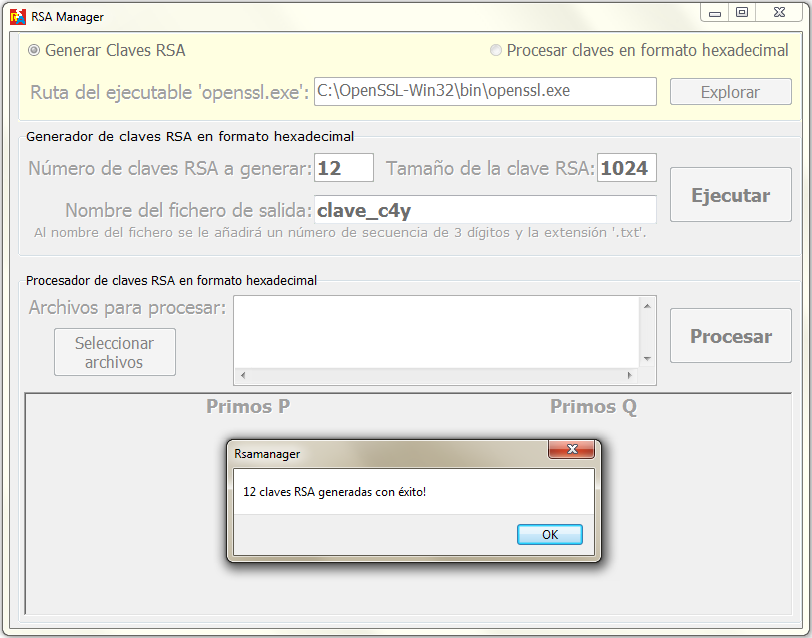 Como has comprobado, la operación más tediosa era convertir la clave binaria a formato texto y encontrar los valores en hexadecimal de los primos p y q para usarlos en el programa genRSA. Sería por tanto muy interesante tener una aplicación que generase automáticamente estas claves y nos entregase los valores de p y q.