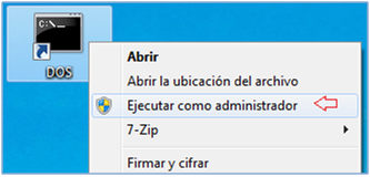 Para no recibir ese mensaje de error, debemos entrar como administrador o, más cómodo, ejecutar DOS como administrador utilizando para ello el botón derecho del ratón en el icono de sistema como se muestra en la siguiente figura.
