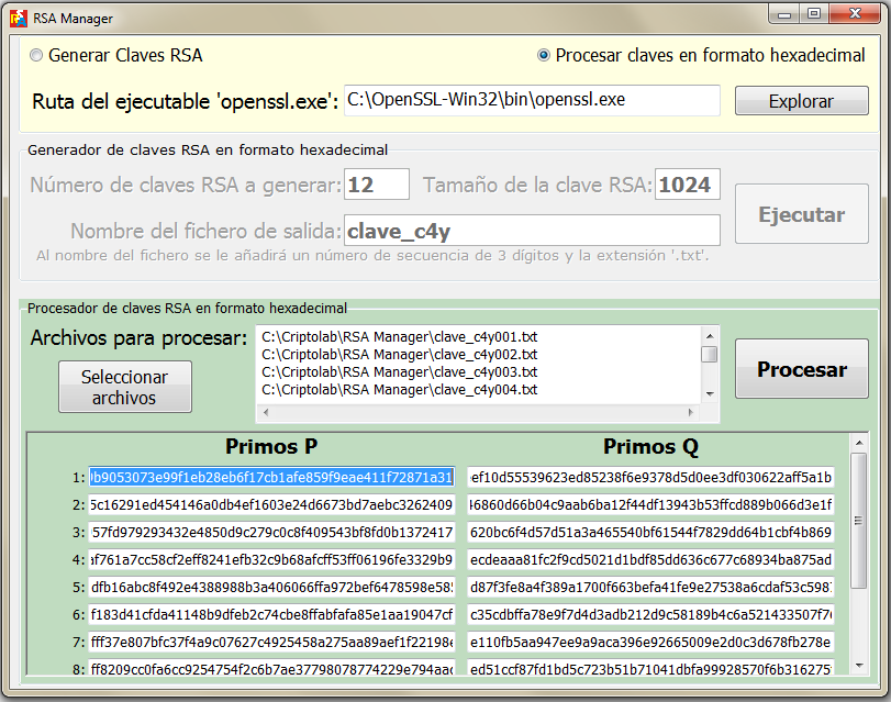 Ahora usamos la opción Procesar claves en formato hexadecimal, damos a Seleccionar archivos, seleccionamos las 12 claves que se han guardado en la misma carpeta donde se ha instalado el programa RSA Manager y pulsamos en Abrir para cargarlos en la ventana. Luego pulsamos en Procesar y se obtiene la siguiente pantalla.