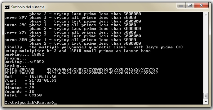 Observa que el último valor de 67.150 segundos corresponde a un tiempo igual a 18 horas, 39 minutos y 10 segundos. En la siguiente figura se muestra una captura de pantalla cuando el programa entrega el valor de p y q pasado ese tiempo.
