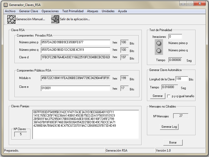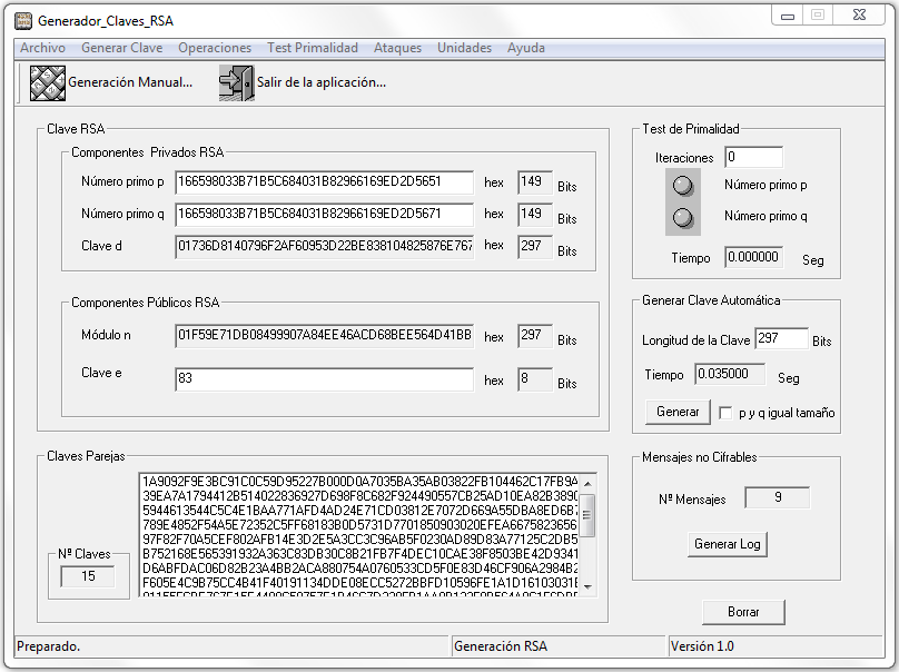 Esta era la clave RSA de 90 dígitos (297 bits) del ejemplo anterior con sus valores en decimal y su conversión con Dec2Hex para usarlos en genRSA: