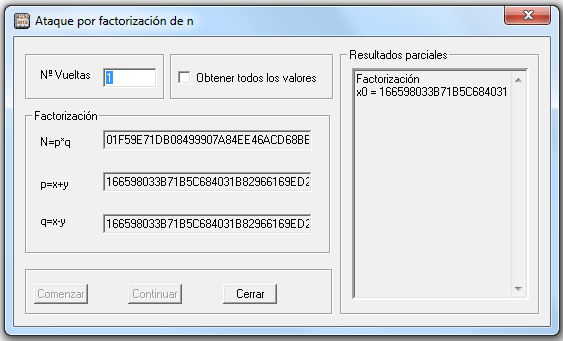 Con el mismo programa elegimos Ataque por factorización y le indicamos que ejecute solamente 1 vuelta, obteniendo de forma inmediata lo siguiente: