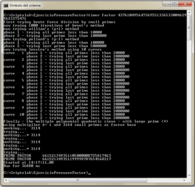 Factorización de n mediante el programa factor que requiere 37 segundos