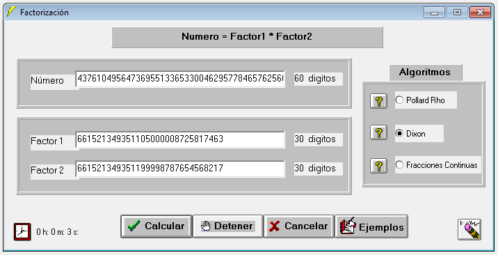 Factorización de n mediante el programa Fortaleza y método Dixon que requiere 3 segundos