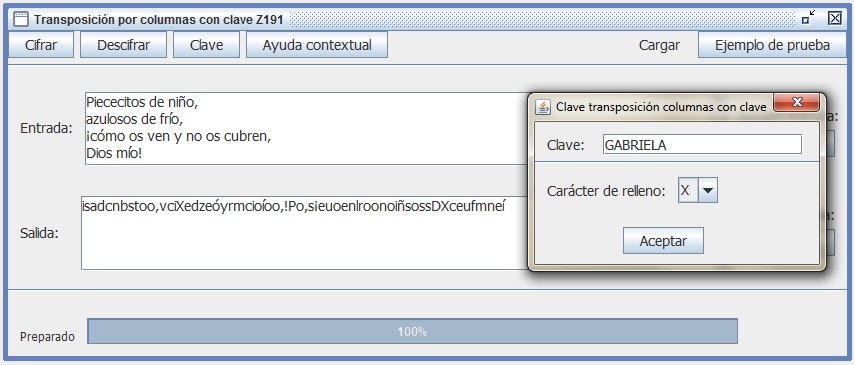 Ahora sí usando Criptoclásicos, comprueba tu respuesta del ejercicio 2.2. Hecho esto, primero que nada cambia en Opciones el alfabeto a ASCII 191, y después cifra con la clave GABRIELA el siguiente texto en claro. Observa cómo se ordenan las dos columnas con letra A de la clave.