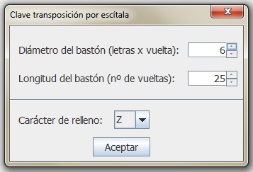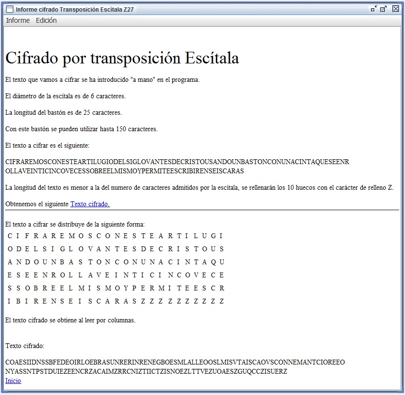Ayuda: una solución podría estar relacionada con un relleno de tantas letras como longitud tenga ese bastón, hasta que se acabe la cinta; piensa cómo lo harías. La otra solución y la más adecuada, tiene que ver con la longitud real de esa cinta, que puede ser mayor o menor en función del tamaño del mensaje. Es decir, no tiene por qué enrollarse toda la cinta hasta el final del bastón sino sólo la longitud justa que permita que el bastón tenga letras del texto en claro en todo su contorno. Comprueba que es precisamente esto último lo que hace el programa Criptoclásicos, realizando este nuevo el cifrado con la misma cinta e igual bastón (25 de longitud y 6 de diámetro) y pidiendo que te muestre el informe de cómo lo ha hecho.