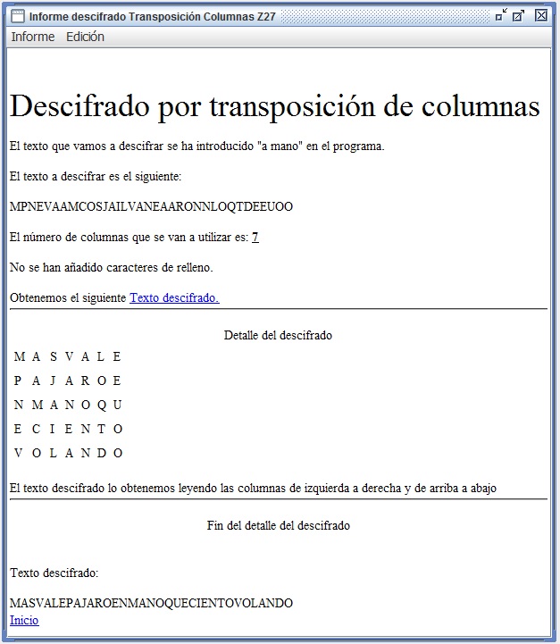 En la figura 3.3 se recoge el informe que entrega Criptocásicos ante el criptoanálisis del ejemplo anterior, donde se observa el período (filas en este caso) encontrado igual a 6, así como la clave de 4 columnas y el texto en claro.