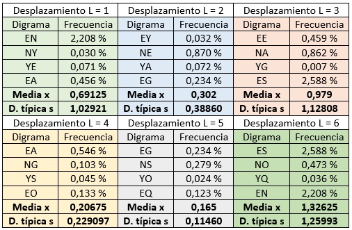 En la siguiente tabla se muestran los digramas encontrados en esos seis desplazamientos, con la media y la desviación típica de cada ventana.