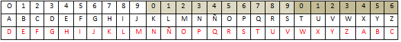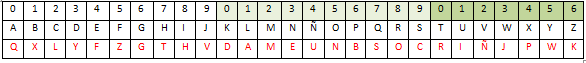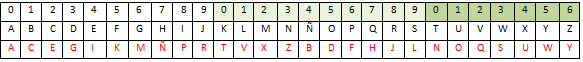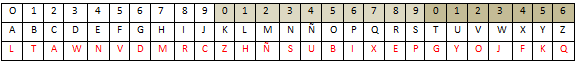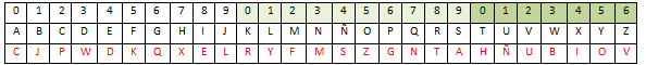 De esta manera, el alfabeto de cifrado para las 27 letras en mayúsculas del castellano quedaría como se muestra en la figura.