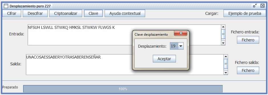 Criptosistemas -> Desplazamiento Puro. Copiamos el criptograma en la caja de texto, elegimos como clave 19 y damos a descifrar, obteniendo: