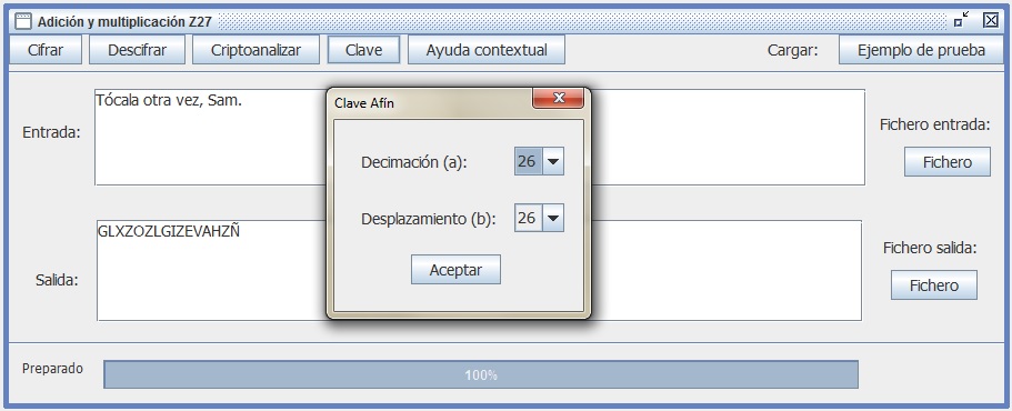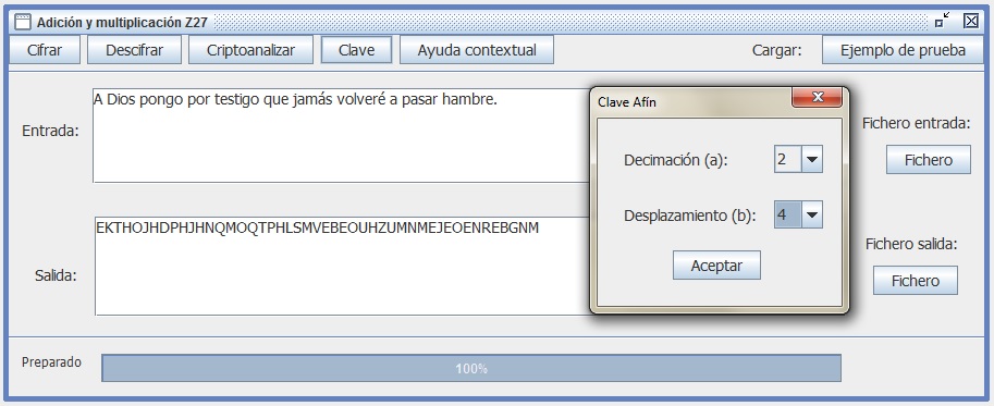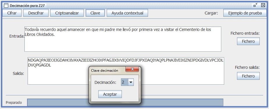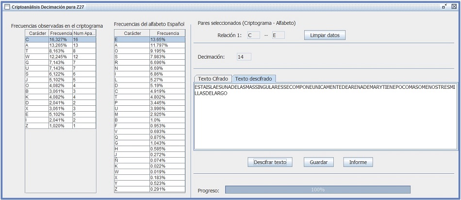 Vamos descifrando entonces el criptograma con esta última ecuación y si obtenemos un texto en claro con sentido, habremos encontrado la clave, en este caso la constante de decimación a. Esto último porque puede darse el caso de que el criptoanálisis entregue como resultado un falso positivo; esto es, un valor de a válido pero que no es el utilizado en la cifra. Si no se obtiene un texto con sentido, probaremos asignando nuevamente a la letra E la segunda letra más frecuente del criptograma u otra, hasta dar con la solución. No obstante, dada la alta redundancia que presenta el lenguaje, normalmente acertaremos en el primer intento o en el peor de los casos en el segundo o tercero. No irá más allá.