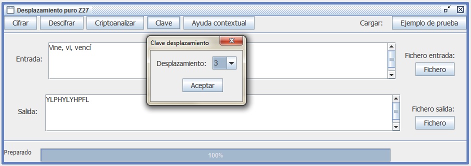 Criptosistemas -> Desplazamiento Puro, copiamos el texto en claro en la caja de texto, elegimos la clave 3 y damos a Cifrar. El resultado es el observado en la figura.