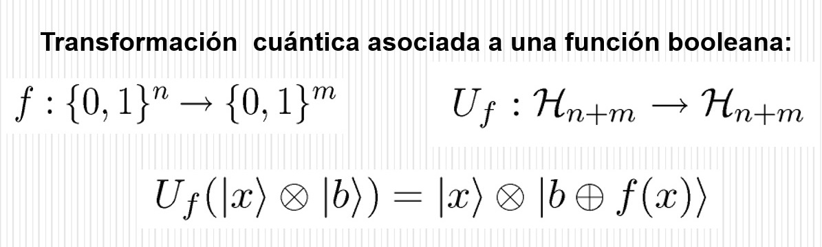 La computación cuántica permite evaluar f simultáneamente sobre todos los posibles inputs, sin más que construir una superposición de todos los estados de la base ortonormal Bn, lo que se obtiene, a partir de |0>, con la transformación de Walsh-Hadamard.